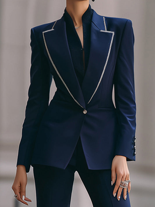 Stylish Single-Breasted Contrast Trim Flared Pantsuit